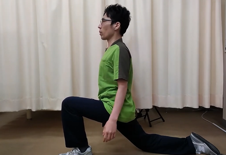 ②前に重心移動して後ろの太ももの前側を伸ばす