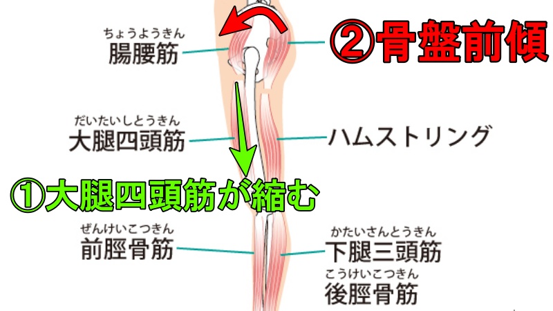 大腿四頭筋や腸腰筋が硬くて骨盤が前傾しているタイプです。大腿四頭筋とは太ももの前側の筋肉で、腸腰筋はコアマッスルやインナーマッスルなどと言われますが、腰の奥にある筋肉です。