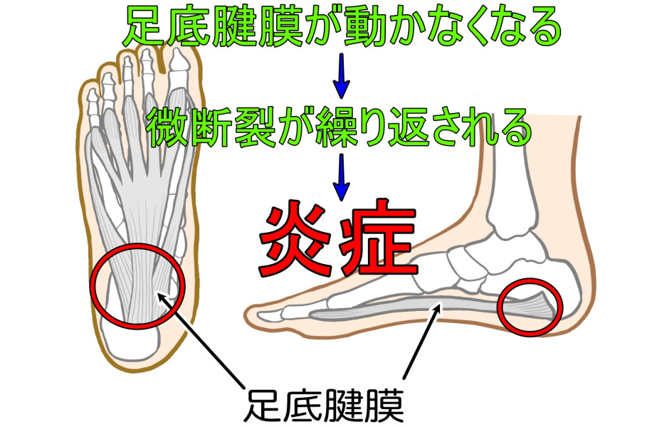 足の機能が低下することによって足底腱膜に負担がかかり、微断裂を繰り返して炎症を起こすものです。