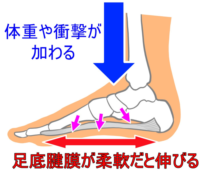 足底腱膜炎の原因は、長い時間歩くことによって足にかかる負担にあります。通常の足では足底の機能をフル活用して衝撃を緩和するのですが、偏平足によって足底の機能が低下すると、足の裏にかかる衝撃が分散しきれなくなります。