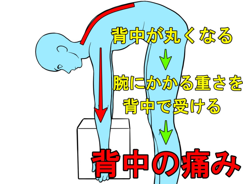 前かがみでの作業は大胸筋や小胸筋など前側の筋肉ばかり使うため、巻き肩になりやすい傾向があります。巻き肩は肩甲骨を外側にスライドさせる作用が働き、背中が丸くなっていく傾向があります。私の施術経験上、引っ越し業者のように重いものを持ったり、長時間しゃがんで作業するお仕事が背中の症状を招きやすい印象です。重いものを持つ際に「片膝をついて持つと良い」と言われますが、上の絵のように腰や背中が丸まっていたらあまり意味がありません。持つ際はあらかじめ腰に力を入れてから持ってください。