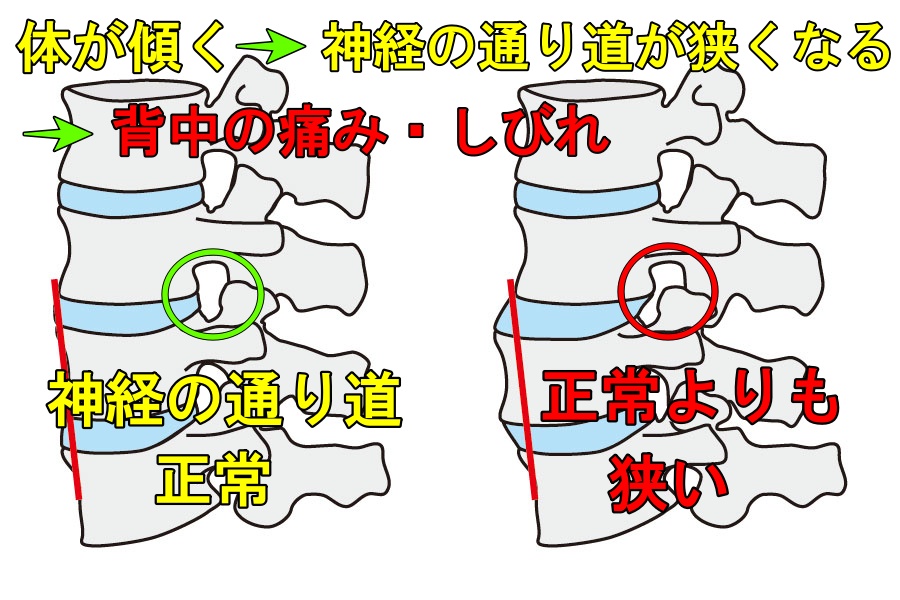 背中の背骨の間には神経が出ていて胸まで伸びます。体が傾いて神経が出てくる椎間孔が狭くなり圧力がかかると背中から胸にかけてピリピリする痛みが走ることがあります。