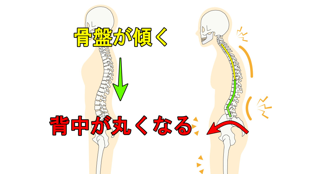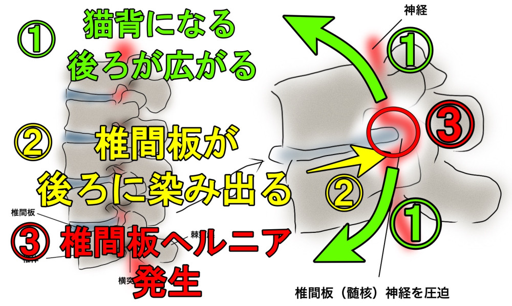 猫背姿勢だと「椎間板ヘルニア」や「ぎっくり背中」になる可能性が高くなります。椎間板ヘルニアは背中にも起こることがあり、背中が丸まると後ろにスペースが空きます。そこから椎間板が染み出てきてしまい神経を圧迫します。