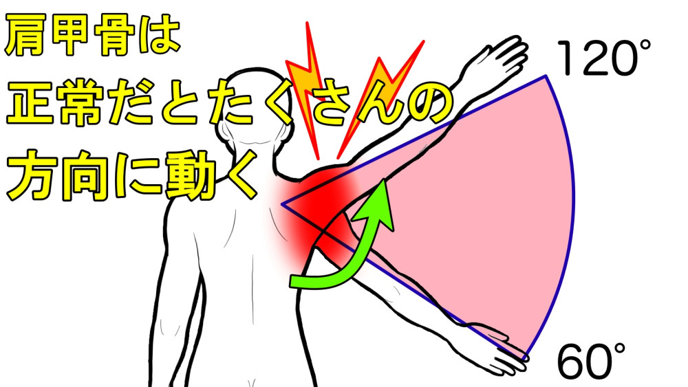 肩甲骨は正常だと絵以外にも外に開いたり内に動いたりと沢山の方向に動きます。その肩甲骨が動かなくなると周囲の筋肉が動かなくなって苦しくなったり、無理に動かすとぎっくり背中などにつながります。肩甲骨が動かなくなるとその分、首の筋肉や肩関節、肘関節で肩甲骨の動きを補おうとし負担をかけます。