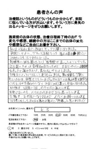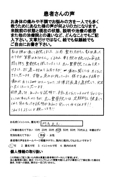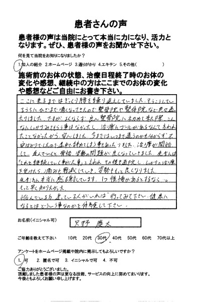 それから2回目、3回目と治療を受け、日増しに痛みが和らぎ2カ月が過ぎ現在はあの痛みが嘘のように成り、本当に当院に来て良かったと思っています。信頼できる先生です。感謝しています。有難うございます。